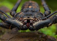This archaic-looking creature with the brute claw arms is a whip spider (Amblypygi). Over 200 species are distributed worldwide, almost all of which are native to tropical and subtropical forests. The first pair of legs of these fascinating animals is greatly elongated and is used as a whip-like feeler to track down prey or obstacles. Prey is grabbed with the pedipalps converted into tentacles. The Amplygi have no venom glands, but it also seems unlikely that prey, once caught, could escape. With their flattened bodies, it is easy for them to hide under stones and lie in wait for prey. I photographed the animal shown in Cahuita, Costa Rica when I and my guide Chris climbed a creek at night to look for snakes and frogs. The body length is approx. 20 mm.